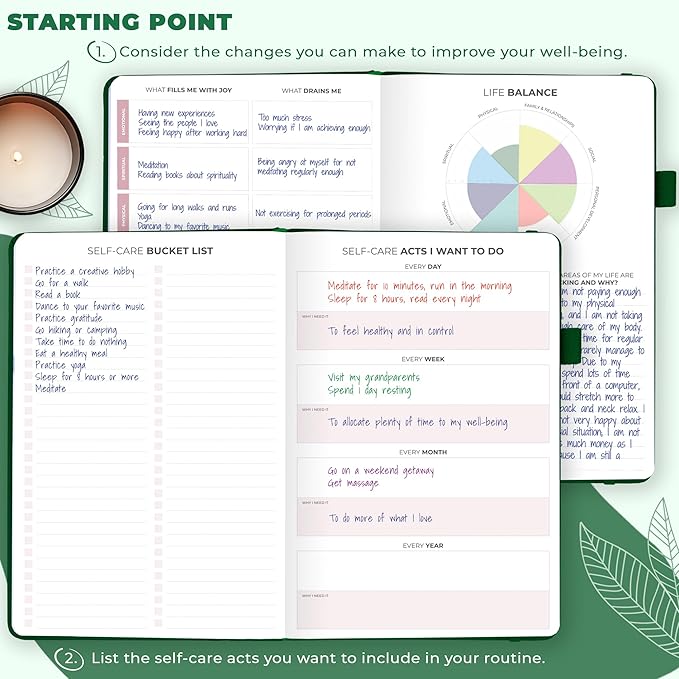 - BUILD A HAPPIER & HEALTHIER MINDSET FOR YEARS TO COME: This self care notebook is filled with prompts, open-ended questions, wellness trackers, and many other tools to help you pinpoint the changes you can make to improve your well-being.