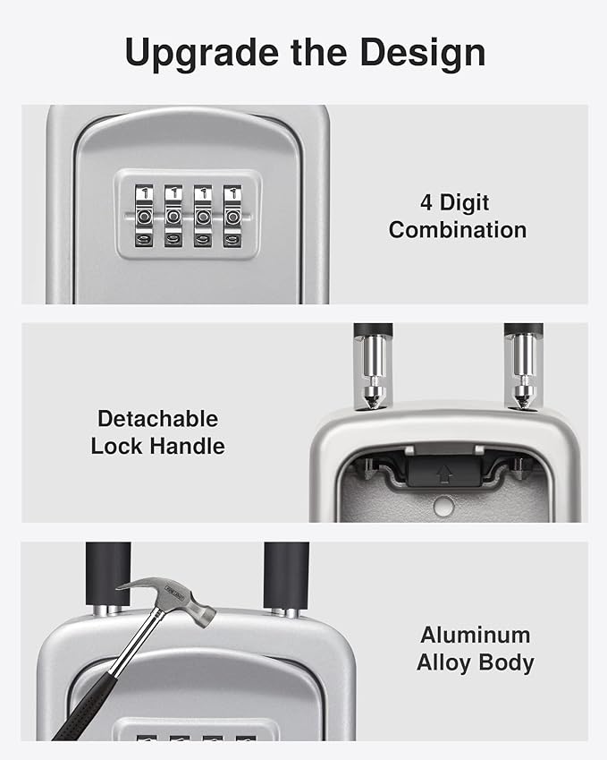 - Sturdy and Durable: The premium aluminum alloy lockbox body prevents the lockbox from being hammered, sawed, or pried open.