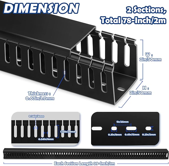 - Easily Manage Your Network and Data Cables: Designed with parallel openings on both sidewalls, making it convenient for you to assemble and wire. Its H2 in x W2 in large capacity can accommodate up to 40 cables (depending on their thickness). This cable raceways kit brings two 39in long cable management raceway (Total 78in), reduce the hassle of splicing