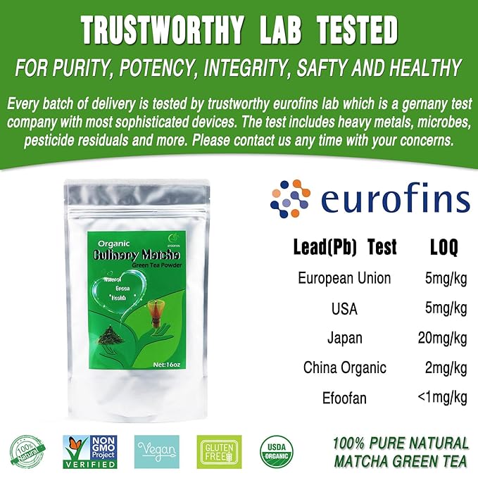 - ✔️ 【100% Organic & NON-GMO】EFOOFAN matcha green tea is USDA/JAS/EC certified organic and conforms to the highest standard test demand conducted by Eurofins's Germany Lab for pesticide residual and heavy metal etc, it is 100% natural and vegan & gluten free.