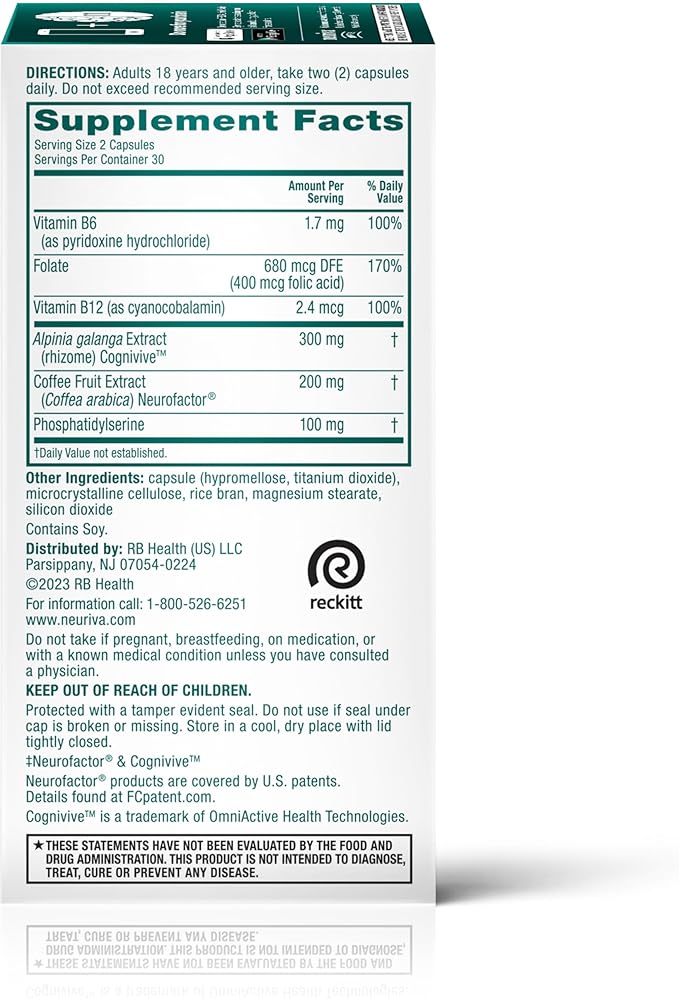 NEURIVA Ultra Decaffeinated Clinically Tested Nootropic Brain Supplement for Mental Alertness, Memory, Focus & Concentration, Cognivive, Neurofactor, Phosphatidylserine, Vitamins B6 B12, 60 Capsules