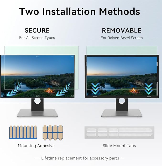 - 【Easy to Install & Reusable】Our 24 inch anti glare monitor screen protector has 2 uniquely designed installation methods: ① Permanent installation- double sided adhesive tape. Suitable for all computers with a screen aspect ratio of 16:9 and a size of 24 inches. ② Removable installation- slide mount tab. Suitable for computer with raised frame, you can slide the filter in and out of the screen as needed, it provide a quick and easy way to remove your monitor screen protector when you don't need.