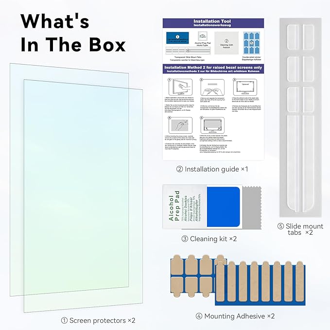 - 【Package Content】You can get 2pcs 24 inch anti blue light screen protector for a better price! Each package includes 24 inch screen protector x2, adhesive strips x2, slide mount tabs x2, alcohol x2, cleaning cloth x2. We are a factory that integrates production, processing and sales, We guarantee that all of our products are premium screen protector. If anything happens, we will send you a new 24 inch monitor screen protector at absolutely no cost. So you can buy with confidence!