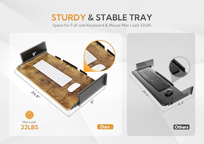 - Spacious Full-Size Keyboard Tray: The standing desk is equipped with a specially designed slide-out keyboard tray, measuring 26.8" X 9.8". This is larger than most keyboard tray sizes on the market, allowing for a full-size keyboard to be placed and providing a greater operational space.