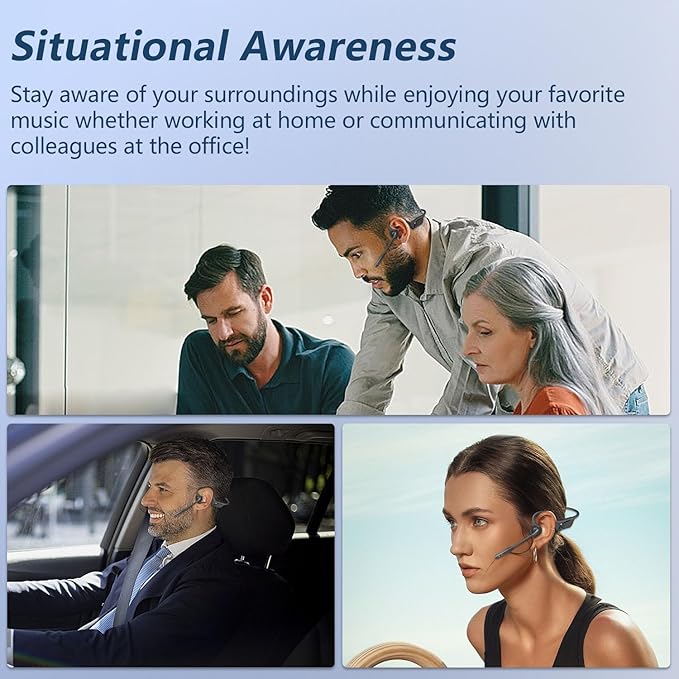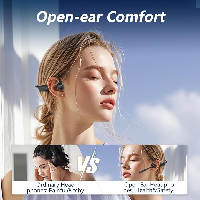 - [Air Conduction Open-Ear Headphones] Bluetooth headset don't need to plug into your ears compared to traditional headphones, it keeps your ear canal clean and protects your hearing from eardrum damage caused by wearing ordinary headphones for a long time. Bluetooth headphones not cover your ears, which ensures your ears stay open and fully alert while listening to whatever you want for maximum situational awareness, safety and connection. (Please check headphone size before purchaser)