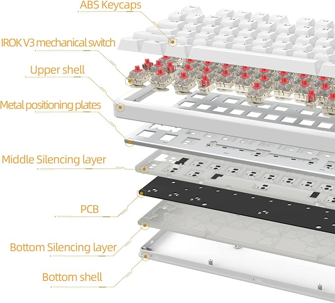 - 【Three Layer Sound Absorbing Design】-FE98 PRO Mechanical Keyboard is padded with three layers of silicone pads between the metal locator plate and the PCB boards. The sound-isolating silicone pads absorb the impact of each keystroke, which not only ensures smooth and comfortable typing feel, but also eliminates most of the noise and makes the keystrokes sound cleaner and crisper. This creates a flexible, soft and clean typing experience.