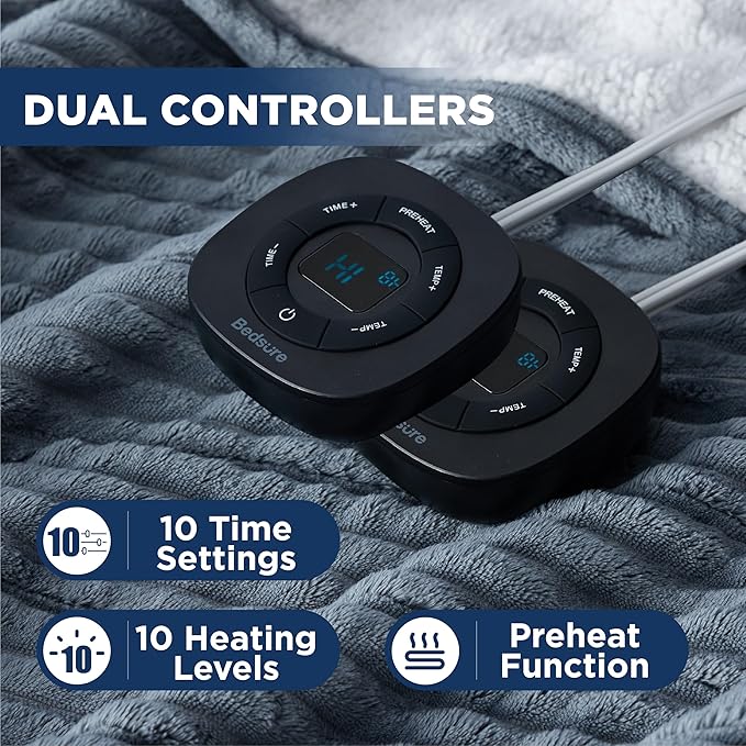 - Easy to Use: This queen size electric blanket with dual control guarantees comfort for thermally incompatible couples. Preheat function conforms to changes in body temperature, keeping you comfortable all night without feeling dry