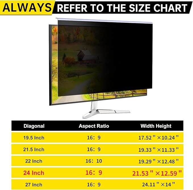 - 【 High Cost-Effective Price 】You can get a 2-pack of 24 inch computer privacy screen for monitor filters at a better price! Fits for 23", 23.6", 23.8", 24" widescreen monitors with a 16:9 aspect ratio. Actual Filter Size: Width: 21.53'' (547mm), Height:12.59'' (320 mm), Diagonal: 24" (609.6 mm). Please verify your computer monitor screen's width and height measurements before ordering. It's not recommended to make your selection based solely on your computer screen's diagonal size.