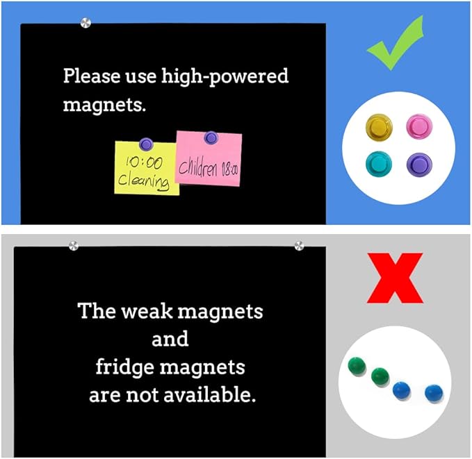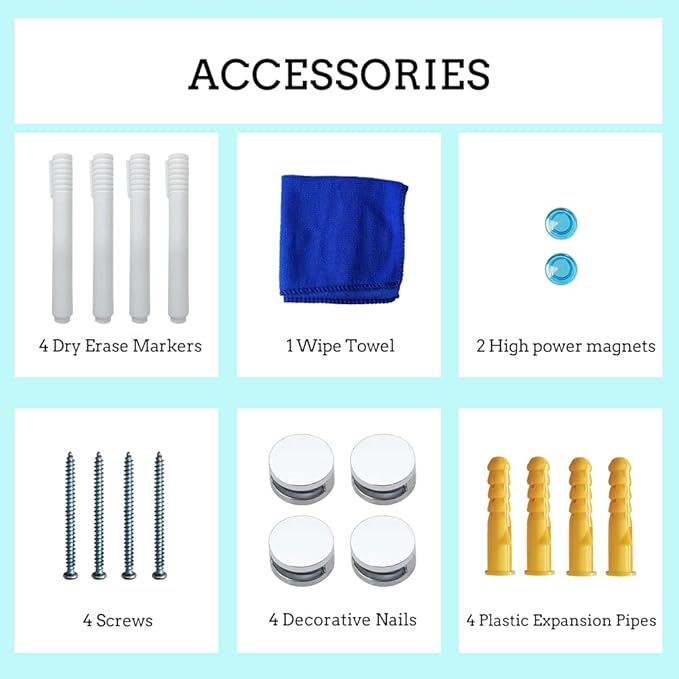 - ACCESSORIES INCLUDED:1 removable marker tray, 4 markers, 2 glass board magnets and 1 eraser. One-stop shopping. Please be noted that only High-Powered Magnets Work on Glass Board.