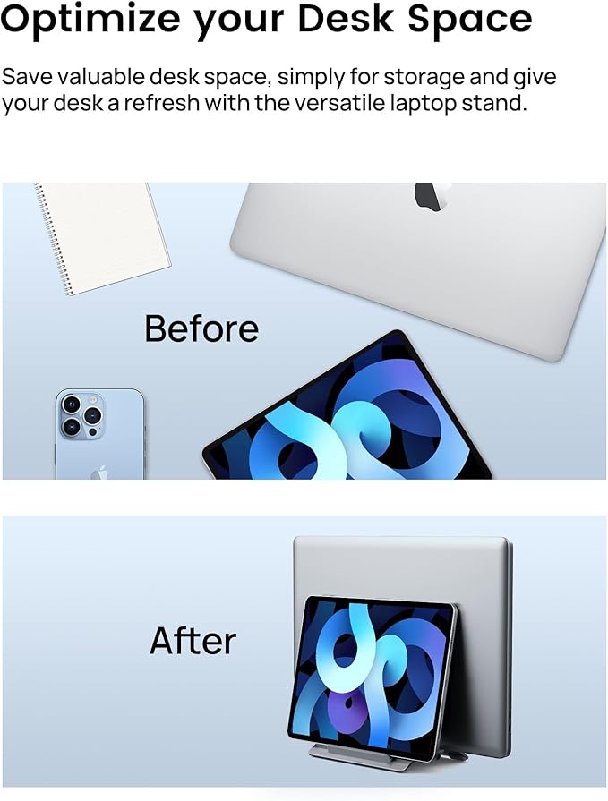 - 【Efficient Heat Dissipation】Prevent laptop crashes by quickly dissipating heat. The vertical laptop stand can be adjusted to optimize heat dissipation and protect against dust.