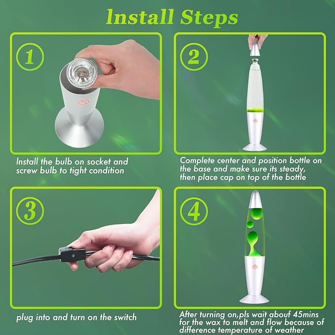 - 【Attention】:Liquid motion lamp is designed to operate temperature around 22-25 degrees celsius, 45 minutes to work. Please wear heat protective gloves or take a dry towel before you touch the lamp with your hand directly if its been working for a long time and keep out of reach of children and pets to avoid burns.