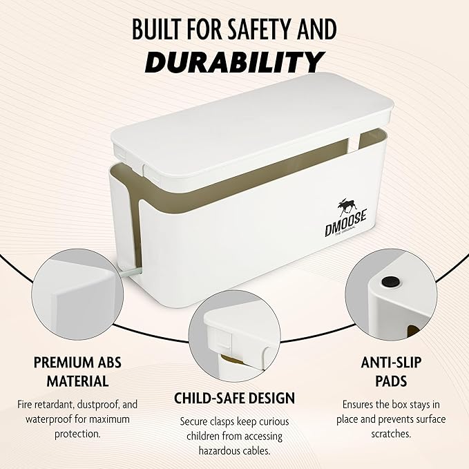 - PREMIUM & HIGH-GRAD ABS MATERIAL: The DMoose Cord Organizer Box is constructed from high-quality fire-retardant ABS material, which safeguards your electronics from dust, spills, and potential hazards while extending the lifespan of your devices.