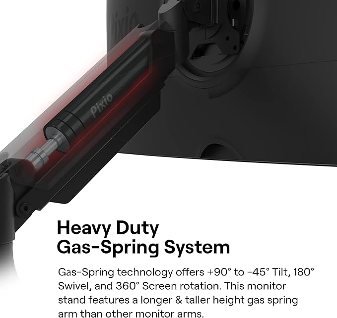 - Height & Articulation Adjustment: Gаs Spring Technology allows for no sagging during use. The arms offer full articulation: +90° to -45° tilt, 180° swivel, and 360° screen rotation. This monitor stand features a longer & taller height gas spring arm than other monitor arms, built for heavy duty application.