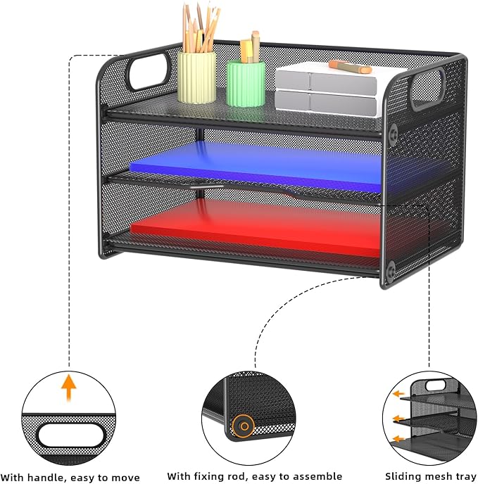 Samstar 3 Tier Letter Tray Paper Organizer with Handle, Mesh Desk Organizer Paper Sorter File Rack Shelves, Black