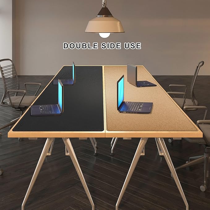 - ECO CORK & PU LEATHER DUAL SIDED MATERIAL: One side of desk pad is PU leather, high-quality material, durable and comfortable. The other side of desk cover mat is eco cork, from natural wood, eco-friendly. Dual side are available for you use.