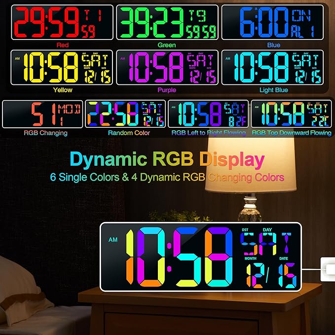 - Special Feature : ①9 Groups of Timers Can be Independently Timing Base Your Need, have 9.5 ft power cord ②10 Colors Available for Digital Display, ③Have Dynamic RGB Changing Color, ④Auto-Dimming, ⑤Ultra High Definition LED Display 180 ° Visible, Hourly Chime, Date/Temperature Loop Display Every 5 Seconds, Can Be Hung or Placed, Memory Function. ①9 Groups of Timers Can be Independently Timing Base Your Need, have 9.5 ft power cord ②10 Colors Available for Digital Display, ③Have Dynamic RGB Changing Color, ④Au… See more