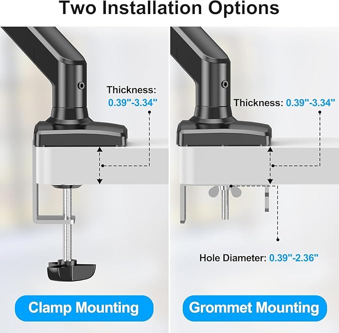 - Two Installation Options: We provide both C-clamp and grommet kits. The C-clamp and grommet base allow for 0.39 to 2.56 inches thick. The dimensions of the hole range from 0.39 inches to 2.36 inches. The clamp laptop stand simplifies assembly. There is no need to worry about assembly, installation can be completed in 10 minutes.