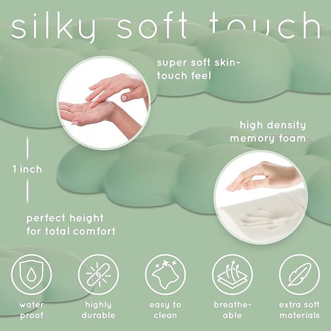 - CLOUD SOFT COMFORT - A premium high density memory foam cloud wrist pad arm rest for keyboard with a new soft-touch breathable material that is ultra comfortable against your skin. This cute and squishy cloud keyboard pad with wrist support is durable and contoured perfectly for you. A keyboard hand rest that is the perfect gaming keyboard wrist rest with wrist support for keyboard rest wrist pad. A super comfy desk wrist rest cloud desk pad