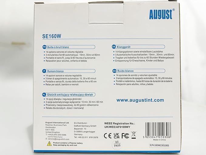 Portable White Noise Sound Machine - August SE160 - Calming, Ambient Sleep Therapy - 14 Soothing Sounds for Babies, Children, Adults - Sleep Aid with Timer - 60-Hour Battery - USB-C Charging - White