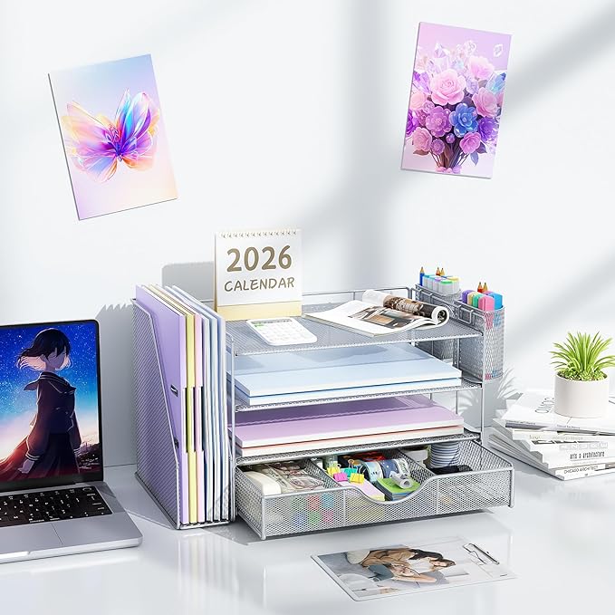 - 📂【Efficient Organization】: The office desk organizers has built-in 4 trays, a file organizer rack, 2 pen holders and a sliding drawer, which can help you quickly identify the storage content of each compartment, and a clean desktop makes you more creative.