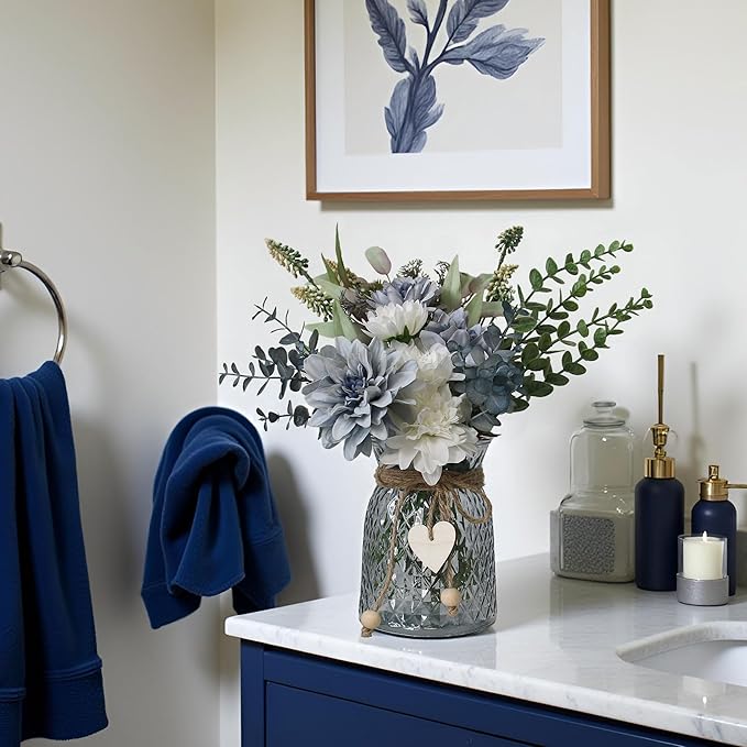 - LEFTOVER's Fake Flowers in Vase:Artificial Silk dahlia Bouquet in Vase include 8 dahlia heads(including 5 big and 3 small) eucalyptus stems and some decorative leaves, and a glass vase with a heart, ball pendant and twine,perfect for coffee table centerpiece and dining table centerpiece decor