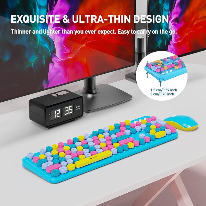 Keyboard and Mouse Wireless,Cute Retro Wireless Keyboard Mouse Combo with Round Key,2.4Ghz Dropout-Free Connection,Typewriter Wireless Keyboard Mouse Set for PC Laptop Desktop Computer-Blue Colorful