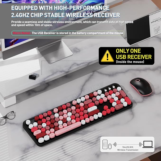 - Cute Wireless Keyboard - Stable 2.4G Wireless Connection : Enjoy a powerful wireless connection with a range of up to 10 meters (393.7 inches) for the keyboard and mouse combo. They utilize a shared Nano receiver, conveniently stored at the bottom of the mouse, Plug and Play.eliminating the need for additional software installation.keeping your desk clean.Keyboard size 17.5 x 5.5 x 1.3 inch With 105 Keys. Mouse size is 4.1 x 2.5 x 1.0 inch. Keyboard net weight: 1.57LB,Mouse net weight: 0.15LB.