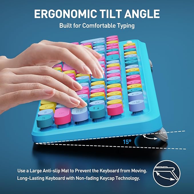 - A fusion of retro style and modern design: The inspiration of these cute rounded keys come from vintage typewriters offering you visual enjoyment and retro feeling to type. The mini Optical mouse is with modern ergonomic design,DPI adjustable(800-1200-1600).The combo will bring you a nostalgic feeling with the eye-catching retro aesthetic.