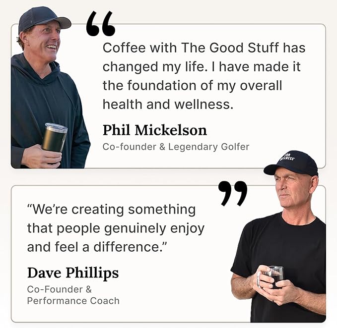 - ALL-DAY PERFORMANCE, TRUSTED BY CHAMPIONS | “Coffee & The Good Stuff has changed my life. I have made it the foundation of my overall health and wellness.” – Phil Mickelson, Co-Founder and Professional Golfer. Developed for Phil by Dave Phillips, elite performance coach to Olympic and professional athletes, The Good Stuff was formulated with the latest science to support lasting energy, recovery, and overall wellness. Today it’s trusted by collegiate and professional athletes.