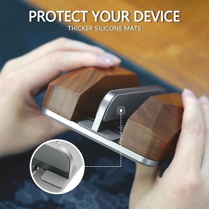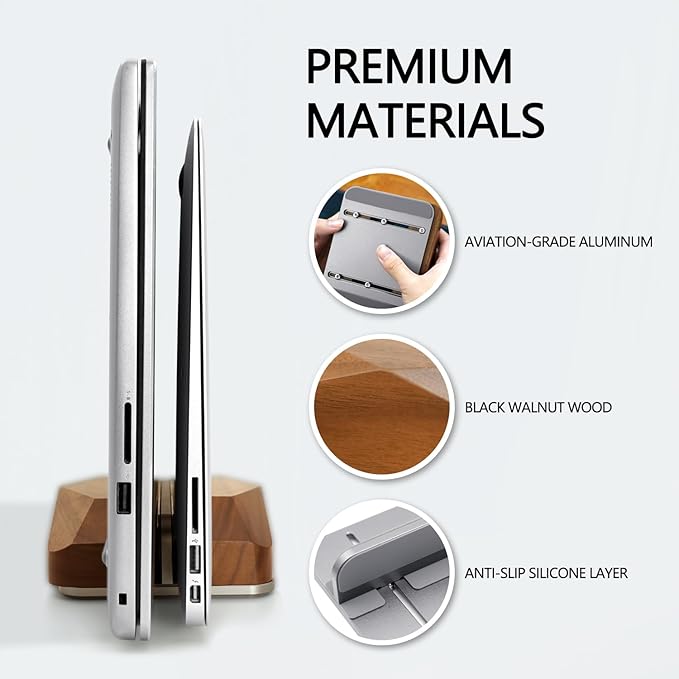- Eco-Conscious Choice: Handmade with natural walnut wood and recyclable aluminum, No assembly required.Our MacBook vertical stand, entirely plastic-free, not only supports environmental sustainability but also elevates the aesthetic of your space.