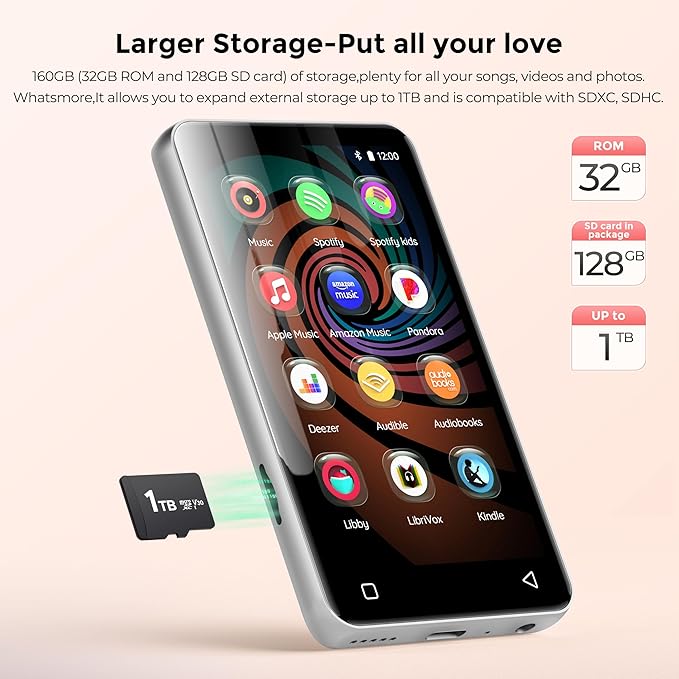 - 💝Listen to a good book-The mp3 player with bluetooth and wifi comes with various popular audio book apps, including Audible, Audiobooks, Libby, LibriVox, and Kindle. Listen to a book and let it ease away your tiredness after a long day. Listening to books can be beneficial for children's eyesight and learning.