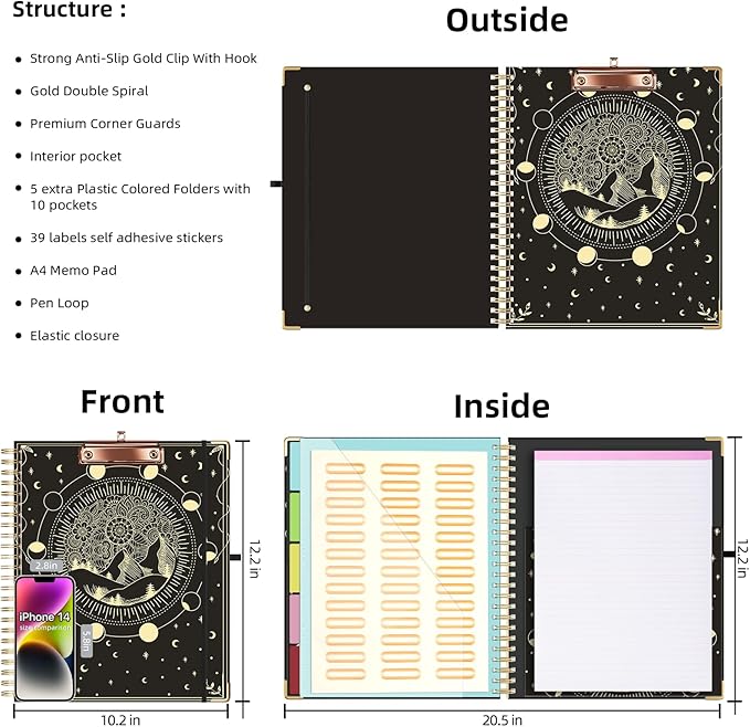Ospelelf Clipboard with Storage 8.5 X 11,Padfolio Organizer, Spiral Portfolio Letter Size with Notepad, Pen Holder, 5 Extra Folder Divider Pages, Elastic Closure Nurse Office Essentials (Moon)