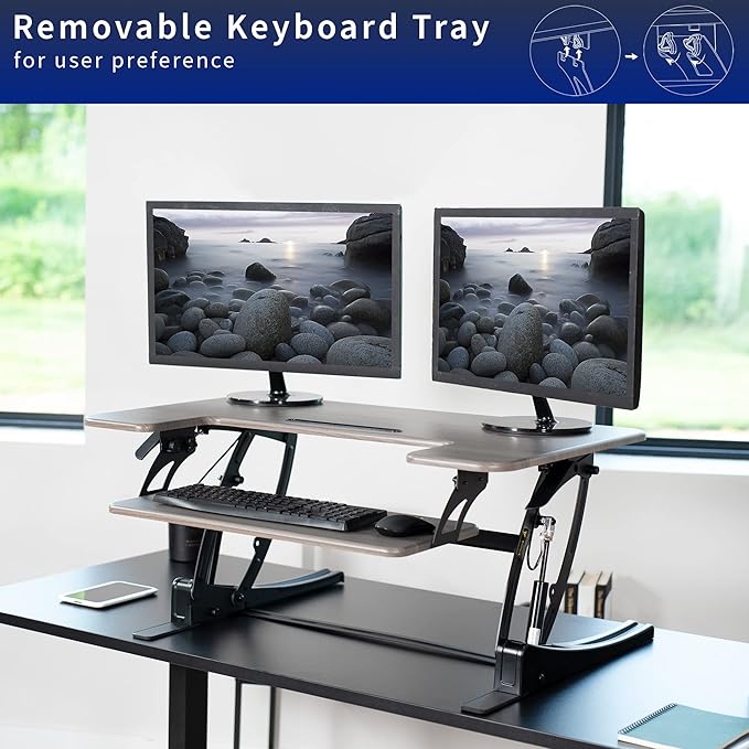 VIVO 36 inch Height Adjustable Stand Up Desk Converter, V Series, Quick Sit to Stand Tabletop Dual Monitor Riser Workstation, Gray Top, Black Frame, DESK-V000VG
