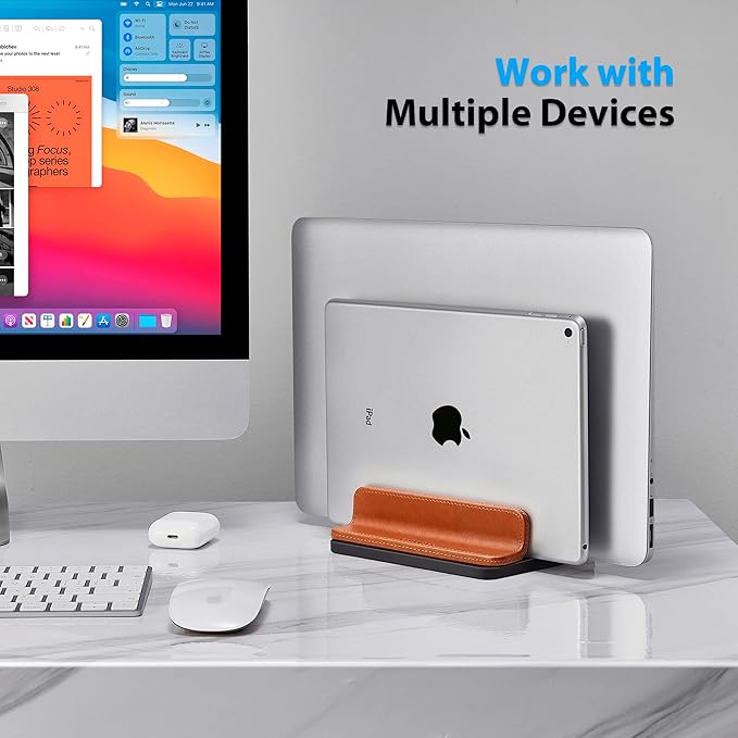 - 【Optimize Desktop Space】The dual-slot vertical stand can cradle up two laptops or phone iPad at the same time, it will keeping your desktop organized and saving space