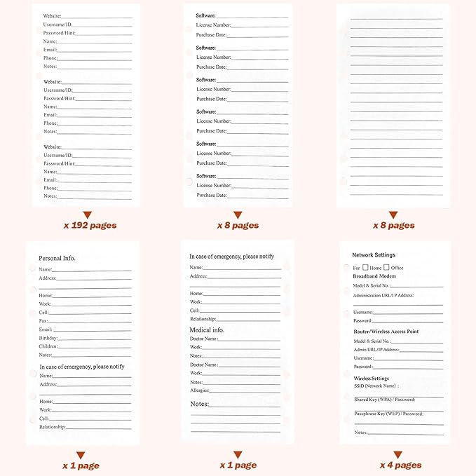 - User-Friendly Layouts: Designed to cater to all your internet needs, our password notebook allows to store up to 576 passwords, along with 48 records of licenses, and essential network, email, and wireless settings. It comes with extra lined pages for taking notes, using them for keeping track of security questions, hints, or any other relevant details. Stay organized and never miss an important detail again!