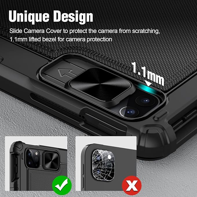 - 【Enhanced Protection】Thickened PC back panel with TPU soft frame perform well in heat dissipation reinforced shockproof design on all four corners which offers unmatched protection to the iPad during use, on the go or in case of accidental knocks/falls. A unique patented sliding camera cover design better protects your lens and ensures your privacy