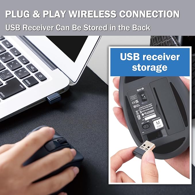 - WIRELESS 2.4GHZ CONNECTION MODEL - Simply insert the receiver into a USB port on your PC. The receiver is ultra-compact and can be stored in the mouse body, making it difficult to lose and convenient to carry around.