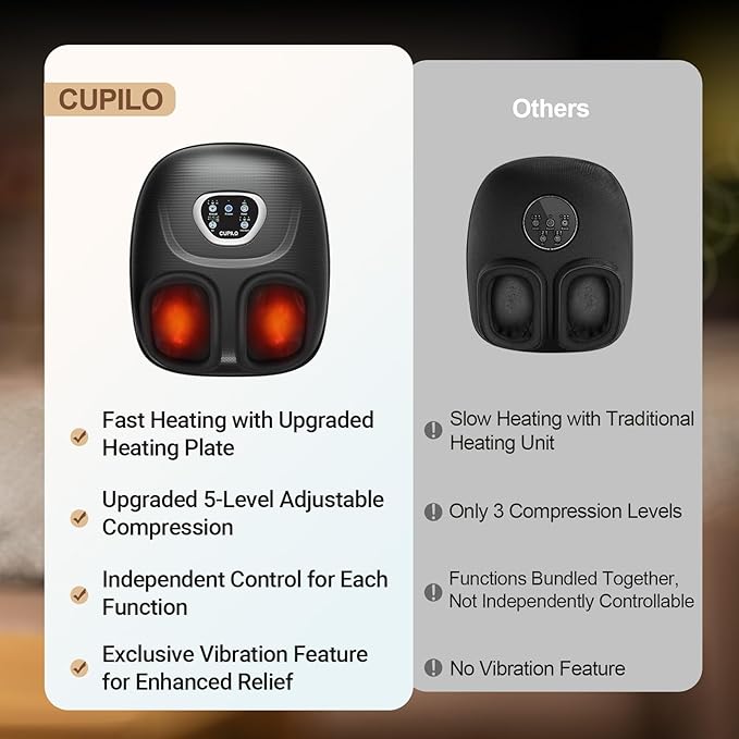 - Unique Vibration Foot Massage: Equipped with three vibration modes, the extra vibration function enhances the overall massage experience. CuPiLo Foot Massager helps revitalize tired feet after long hours of standing or walking, offering neuropathy pain relief for feet and improved circulation.