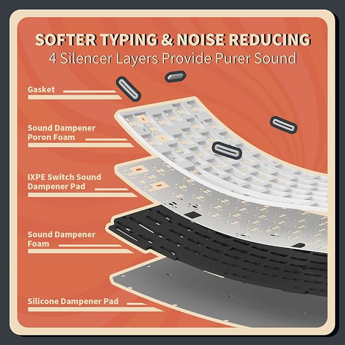 - GASKET MOUNT Structure - Compared to the regular ”stiff” screw mounted mechanical gaming keyboards, the K75 PRO gasket keyboard features an upgraded 1.2mm slotted PCB, and 4 high quality sound absorbing layers that create a cushion between the plate and the base, providing a consistent, softer, and more comfortable typing feel and pleasing acoustic feedback.