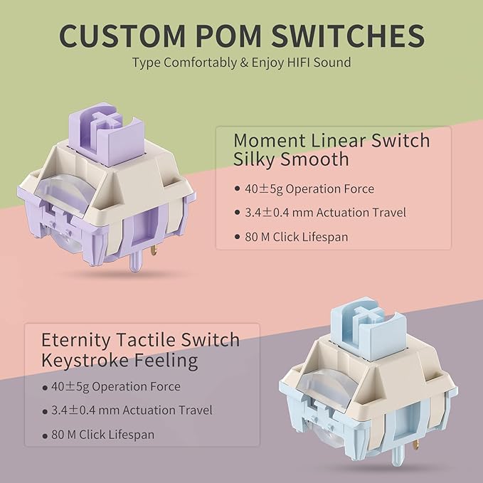 - Premium Custom Hot Swap Switches - The pre-lubed moment linear switches with north-facing transparent light diffusers provide a silky smooth typing experience, an amazing out-of-the-box crisp typing sound, and a brighter RGB backlight effect that is friendly to RGB enthusiasts. The hot swappable PCB of this gasket mounted keyboard is compatible with 3Pin or 5Pin Switches.