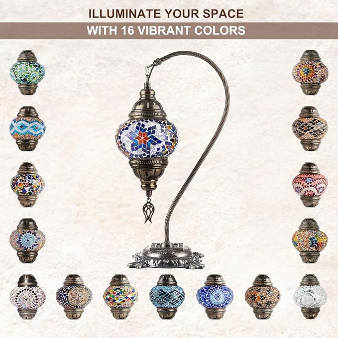 - A Touch of Elegance: This Turkish lamp features an elegant antique glass swan neck that complements the vibrant mosaic lamp shade. Our handmade Moroccan lamp reflects tradition with a brass-colored metal base and large colorful patterns.