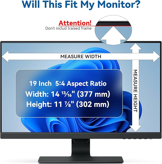 - 【COMPATIBILITY】2 pack 19 inch anti spy computer privacy screen dimensions: Width: 14 13/16" (377 mm), Height: 11 7/8" (302 mm), Diagonal: 19" (482.6 mm)- Aspect Ratio 5:4, exclued the raised frame. This computer privacy screen fit a variety of 20"computer monitor, compatible with HP, Dell, Acer, Asus, Sceptre, Samsung, Levono, KOORUI, PHILIPS, LG, AOC, AOYODKG, SANSUI,View, Sonic,BenQ, Amazon Basics and other monitor brand.