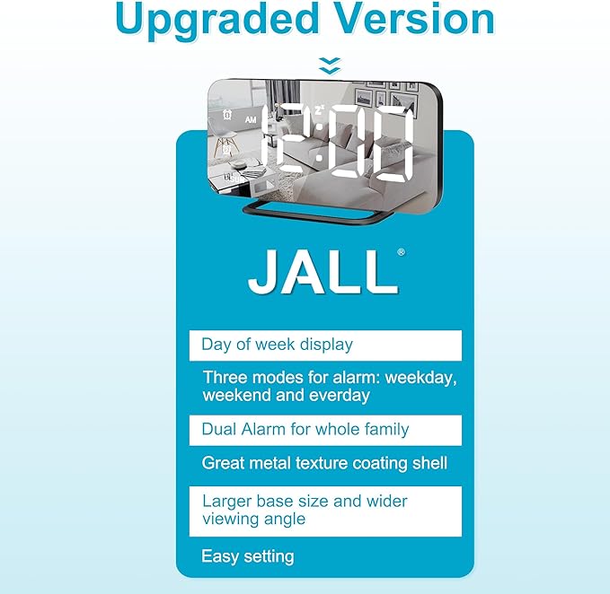 - 【Size and Design】About 6.7 inches (L 6.4 inches * W 3 inches) HD mirror screen display allows you to use it as a mirror to groom your looks while viewing the time. The alarm clock body has been redesigned to reduce its thickness to only 0.4 inches. Its sleek and simple design makes it both practical as an alarm clock and fashionable as a decoration.