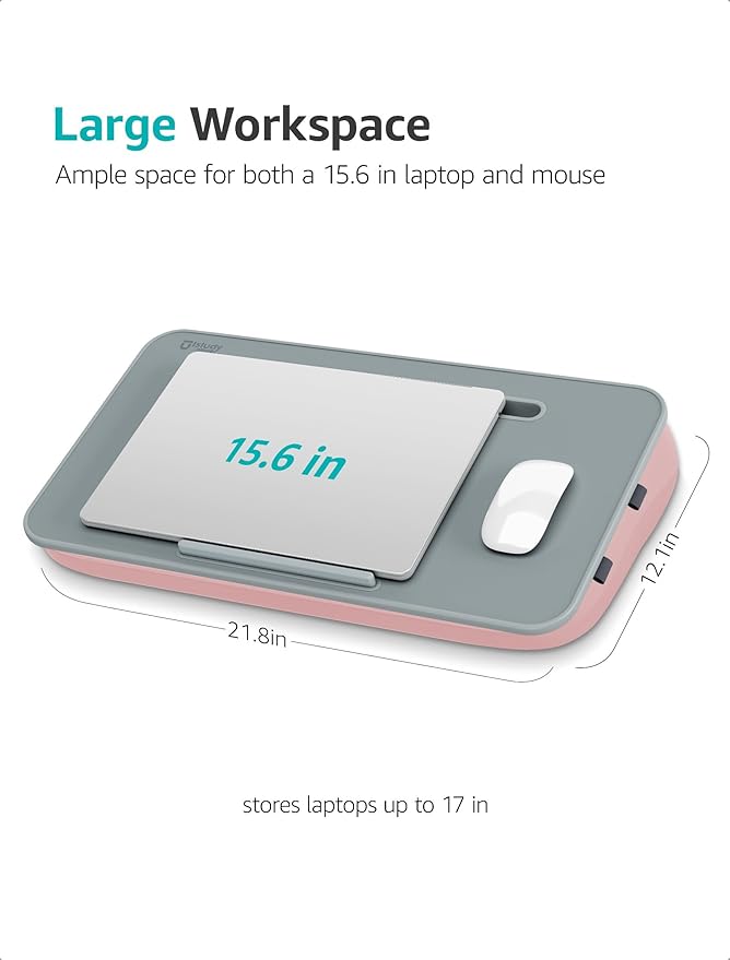 - 2. [Large Workspace]: The desktop of the laptop desk measures 21.8 inches wide and 12.1 inches deep. It can fit laptops up to 17 inches. There is enough surface space for a mouse only when used with laptops that are 15.6" in size or smaller.