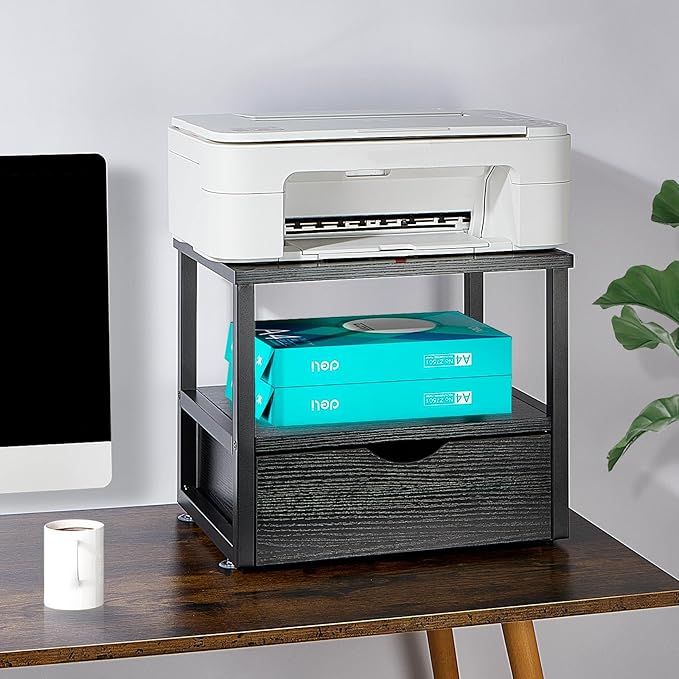 - ✅【HIDDEN STORAGE DRAWER + 2-TIER DESIGN】-Organize ink, cords, and paper in our 2-tier printer stand with storage. Features a smooth-gliding drawer that tucks clutter away—ideal as a desk top organizer shelf with drawers