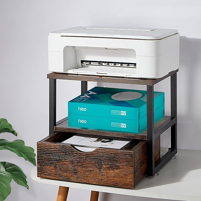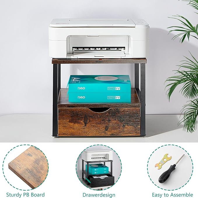 - ✅【HIDDEN STORAGE DRAWER + 2-TIER DESIGN】Organize ink, cords, and paper in our 2-tier printer stand with storage. Features a smooth-gliding drawer that tucks clutter away—ideal as a desk top organizer shelf with drawers!