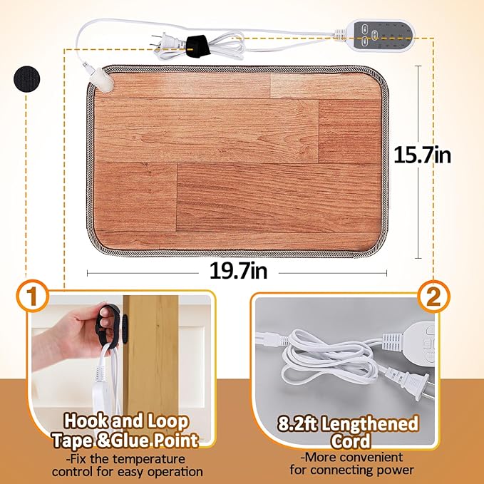 - Convenient to Use: The size of the electric foot floor heating pad is 15.7" × 19.7", which is small and easy to carry. When you are not using it, you can easily fold it up without taking up storage space. The wire on the control has been lengthened for easier use. With the hook and loop tape, glue point to fix the temperature control for easy operation.