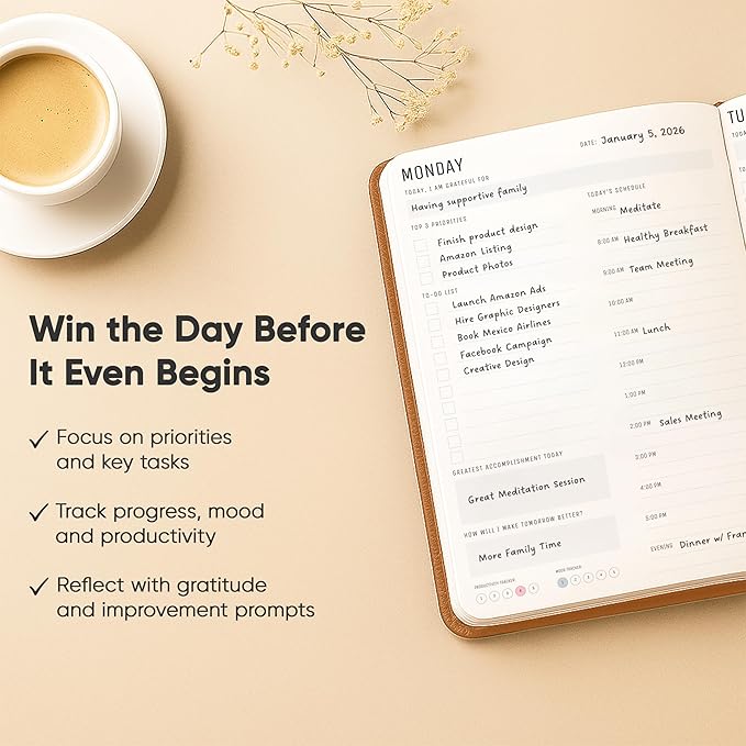 - Comprehensive Daily Workflow Planner: This 2025-2026 Undated Daily Planner combines daily, weekly, and monthly planning spreads, along with goal tracking and reflection prompts. It’s the ultimate tool for organizing your life, setting priorities, and staying productive.