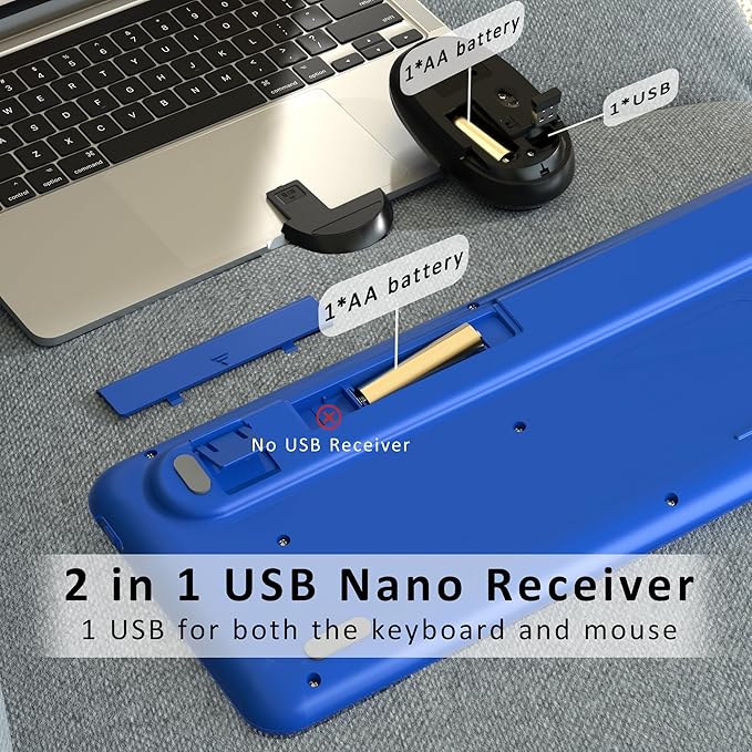- ONLY 1 USB RECEIVER: The keyboard doesn’t have a USB receiver, wireless keyboard and mouse share 1 USB receiver, placed near the mouse battery slot