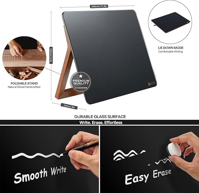 Black Glass Desk Whiteboard with Reversible Wood Stand, Small Portable Desktop Dry Erase White Board, Reusable Desk Notepad Easel 6.7"x9.5" for Office, Home, Kitchen, Marker&Eraser Included, Yeoux
